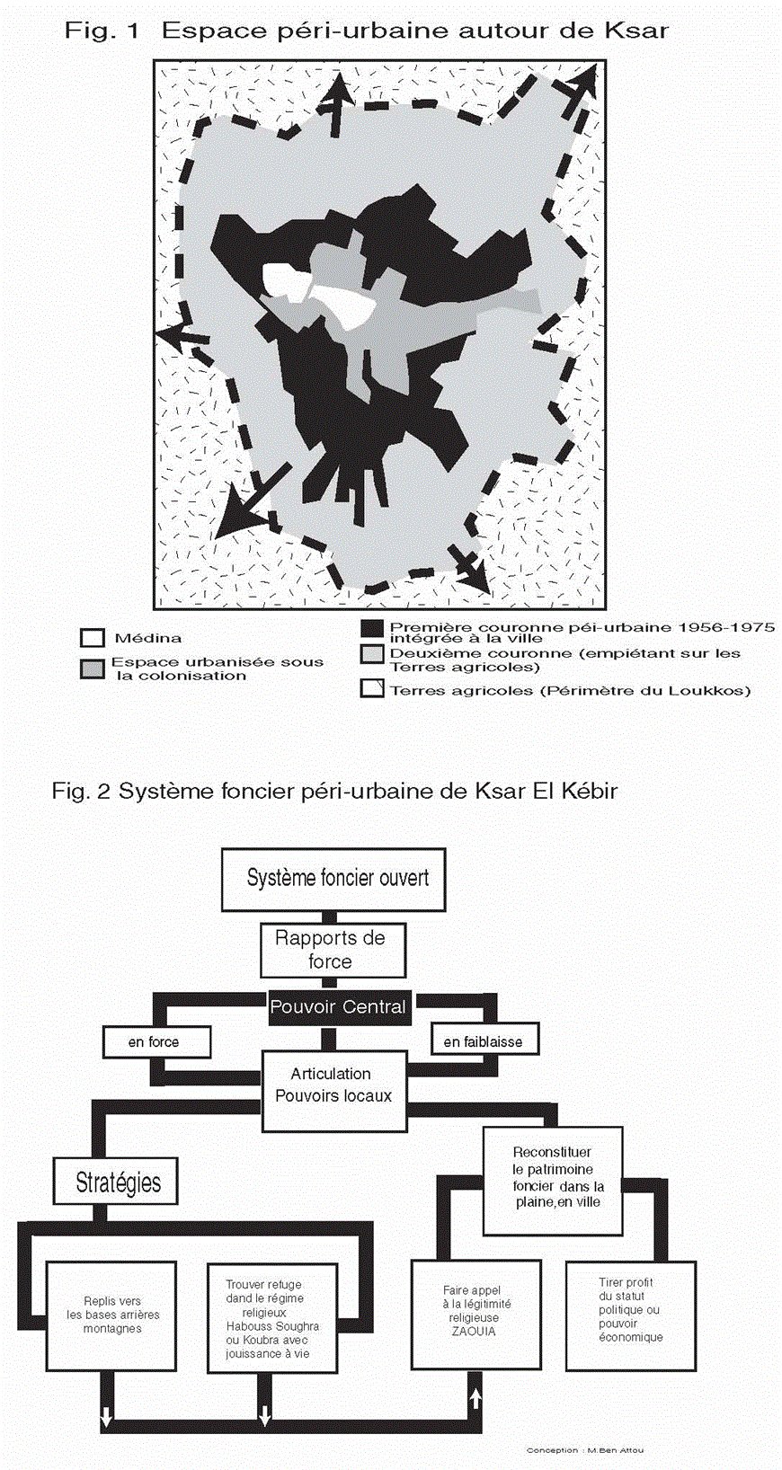 La péri-urbanisation est donc un phénomène mobile qui ne date pas d'aujourd'hui. Certes l'industrialisation tout comme la prolifération de l'informel dans les grandes villes ont donné plus de l’ampleur à la péri-urbanisation mais, dans les zones à caractère frontalier et les zones à fortes potentialités agricoles on peut parler dans les années 1970 de zones péri-urbaines. Le cas de Ksar-el-Kébir se prête bien à cette situation. En effet, dès la fin des années 1970, on peut déjà distinguer entre la ville proprement dite, constituée des deux quartiers de la médina, du quartier "européen" (Scrinia), des propriétés du Makhzen, de l'Etat espagnol ainsi que la propriété des colons et la zone militaire, en plus de la couronne péri-urbaine constituée du quartier, Al bario et des douars. Ces derniers sont installés sur les meilleures terres agricoles de la plaine de Ksar, et qui se sont urbanisés pendant les années 1970 à la faveur de l'initiative privée, selon un mécanisme foncier obsessionnel.