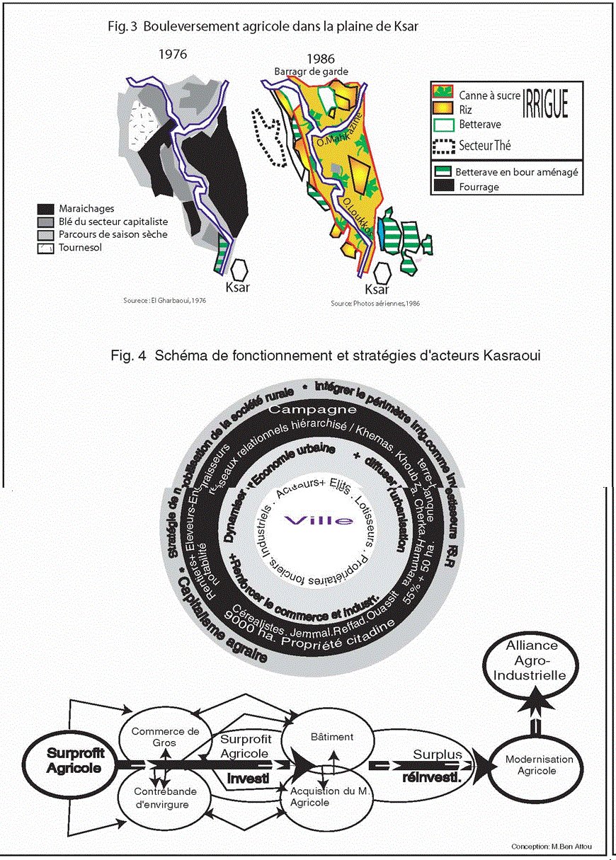 La modernisation agricole depuis 1975 et la réalisation des unités agro-industrielles dans le cadre du périmètre agricole du Loukkos ont certes bouleversé le monde rural et améliorer les conditions de vie des ménages ruraux dans la plaine de Ksar, le plateau Rmel d'Aouamra et les Basses collines des Totbas. L'Etat a injecté plus de 2900 millions de dh. pour la mise en place des équipements hydro-agricoles (76%) et l'infras­tructure d'encadrement agro-industriel. Toutefois, ce développement local doit aussi beaucoup à la dynamique des élites kasraouies. Ces derniers ont su, grâce à leurs disponibilités foncière et financière, développer une stratégie, unique en son genre dans tout le nord-ouest marocain, leur permettant de mobiliser la société rurale et de dynamiser l'économie urbaine tout en s'attribuant le soutien de l'administration locale. A l'amont, cette stratégie a permis la pénétration des élites kasraouies dans le périmètre irrigué, pas seulement en qualité de notabilité religieuse ou politique mais en tant qu'investisseurs d'un surproduit agricole accumulé sur lequel l'Etat, lui même, compte pour réaliser, dans un premier temps, son programme sucrier 1975-2000 et le développement des cultures intégrées et, pour couvrir, dans un deuxième temps, son retrait. A l'aval, la stratégie est simple : le surprofit maximum tiré de la terre et de la disponibilité d'une réserve considérable du capital privé - conjugués à une parfaite connaissance des milieux urbain et rural - sont progressivement investis dans le commerce de gros, la contrebande d'envergure, le bâtiment et l'acquisition de matériel agricole.