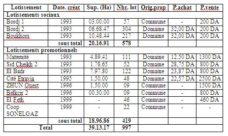 La politique conservatrice adoptée par l’Etat algérien depuis l’indépendance, les moyens et les pouvoirs de décision ont fait de lui le seul acteur capable d’intervenir concrètement dans le marché foncier dont il a l’exclusivité. Par sa politique de lotissements publics, il a pu mettre en place un véritable système de production du sol urbain, doté d’une organisation technique et financière spécifique. Mais «au-delà des aspects purement techniques et administratifs, la réalisation des lotissements et leur répartition ont abouti dans la pratique à une réfutation du discours idéologique»6. Les résultats obtenus sont diamétralement opposés aux objectifs assignés à la réforme foncière: le sol a été soumis à une érosion multiforme qui s’est traduite le plus souvent par une agression du domaine agricole et des occupations illicites. L’attribution des lots a profité surtout aux couches aisées et moyennes dont les moyens financiers sont substantiels. «La démocratisation du logement par le lotissement réalisé par l’Etat n’est qu’illusoire dans ces conditions»7 puisqu’il constitue lui-même une réfutation du discours sur la démocratisation. Les années quatre vingt dix correspondent à une conjoncture de réajustement politique, économique et social, l’Etat s’engage dans une nouvelle politique réformiste qui touche de multiples domaines de la vie sociale et met à l’ordre du jour deux questions essentielles: la pénurie des logements et la crise urbaine. Dans ce contexte, une nouvelle politique foncière s’est dessinée à travers la promulgation en 1990 de la loi d’Orientation foncière. L’abrogation de l’ordonnance 1974 fondée sur le monopole des communes sur les transactions foncières a mis en place de nouveaux mécanismes de production du sol urbain dont la mobilisation est soumise à la loi de l’offre et de la demande. Le sol urbain acquiert de nouvelles valeurs économiques et urbaines. Dans le cadre de cette nouvelle politique, l’Etat espérant rectifier le tir a mis sur le marché une offre foncière diversifiée pour satisfaire aux besoins des différences couches de la société urbaine. Deux types de lotissements se sont développés, les lotissements promotionnels et les lotissements sociaux destinés respectivement aux couches sociales aisées et moyennes.