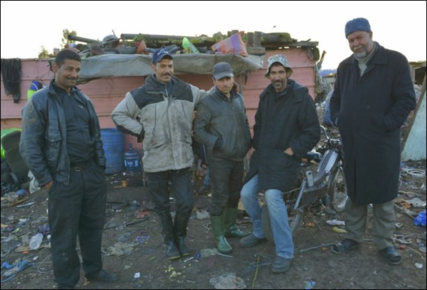[15] Légende. Les récupérateurs de la décharge, où 750 bennes-tasseuses déposent quotidiennement 4000 tonnes de déchets du Grand Casablanca, travaillent et habitent les douars voisins. Sur la décharge, cohabitent des éleveurs de bétail (environ 1000 vaches, chèvres et moutons), des collecteurs de déchets verts destinés à être revendus aux paysans, des vendeurs de thé et de nourriture ainsi que des mouettes et des rats. La décharge est un monde clos, violent, mafieux où le travail est pénible, dangereux