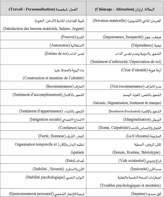 بيّنت الدراسة أنّ البطالة تعتبر وضعية صعبة بالنسبة للمبحوثين. وتظهر معاني وتصورات العمل في دراستنا من خلال المعاناة التي تحدث للأفراد في غيابه، وهي مُستمدة من مُعاش مؤلم، في محاولة لتجاوز الارتهانات وتحقيق الذات وذلك من خلال بحث متعدد ضمن سيرورة الشخصنة:
