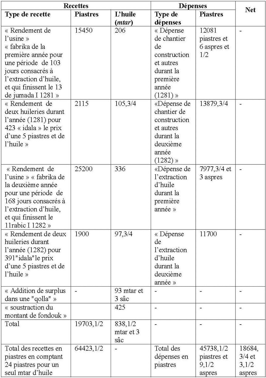 [1].« Louange à Allah, les comptes de Prince Brigade Mahmûd Aziz sur les recettes de l’usine "fabrika" et de deux huileries sultânî "macsrasultânî" situées à la Dabdâba, destinées pour la trituration des olives, et les dépenses pour accomplir cette tâche durant  les deux années précédentes jusqu’au 22 rabicII 1282H/1865-1866… le total de ces recettes citées ci-dessus est de 64423,1/2 piastres et ces dépenses réclamées en second lieux sont de 457638,1/2 piastres et 9,1/2aspres. Des détails de comptes qu’on retrouve  dans un autre registre. La soustraction des dépenses de la totalité des recettes atteint un reste de : 18684,3/4 piastres et 3,1/2 aspres ». Ces sommes ont été payées et remboursées au ministre Mustapha le Grand à cette date 1282H/1864-1865 ».extrait du registre n° 2246 (A.N.T).