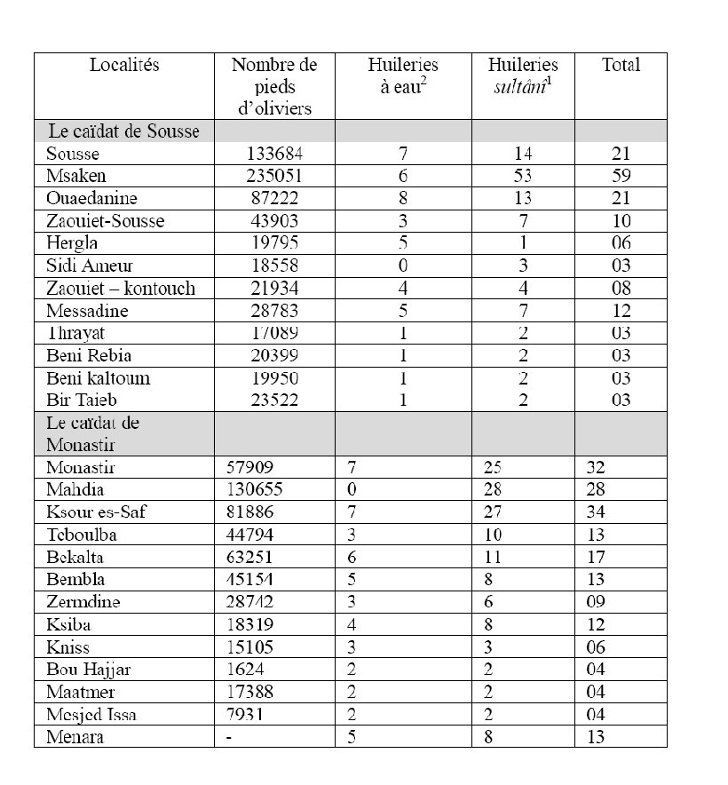 [1] Recensement des huileries du Sahel par les élèves de l’École polytechnique du Bardo. Bibliothèque Nationale. Don de H.H Abdel Wahab .N° 18669. Cité par Dalenda, Bouzgarrou-Larguech, Watan al-Monastir : fiscalité et société (1676-1856), Pub. de la faculté des lettres de la Manouba, 1993, p. 28-29. Khélifa Chater, Insurrection et répression dans la Tunisie du XIXème siècle : La Mehalla de Zarrouk au Sahel (1864), Pub. de Univ. de Tunis, 1978, p. 20.