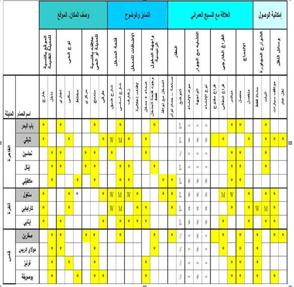 جدول 1: دراسة تحليلية للنواحي المكانية والاجتماعية للحمّامات موضع الدراسة