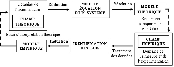 Walliser[5] annonce que « la notion de modèle recouvre toute représentation d’un système qu’elle soit mentale ou physique exprimée sous forme verbale, graphique ou mathématique ». Cette dernière conception, très large du modèle, doit être précisée dans le cas spécifique des sciences physiques par la notion de médiateur. Tout modèle, à quelque niveau qu’il se situe, peut être considéré comme un médiateur entre un champ théorique dont il est une interprétation et un champ empirique dont il est une synthèse[6]. La figure 1 traduit ainsi les deux modèles opposés, issus d’activités intellectuelles différentes. L’apport de certains logiciels éducatifs, obéissant aux critères de l’EIAO[7], ont fait leur preuve dans le système éducatif où les processus cognitifs impliqués vis-à-vis de la conceptualisation du réel, sont favorisés suivant des scénarios pédagogiques inhérents à l’apprentissage autonome.