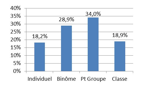 La figure 10 de la question Q13 montre qu’apparemment les pratiques coopératives, en petit groupe (34%) et en binôme (28,9%), sont beaucoup plus utilisées dans l’étude des simulations. Les modes individuel et classe affichent pratiquement le même pourcentage (environ 18,5%) et ne sont pas négligeables.