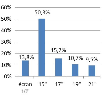 Nous avons voulu connaître les habitudes de travail des étudiants en matière de taille d’écran : les réponses dues à la figure 12 de Q16 nous informent que la moitié (50,3%) utilise le 15" que nous jugeons surtout comme usage plus ou moins personnel[1], alors que le reste est réparti entre les 10", 17" et 19" (matériel de laboratoire et/ou de maison). Le taux de 9,5% dû à l’écran 21"ne coïncide pas avec un usage au laboratoire, et nous pensons que cela correspond à une mauvaise évaluation de la taille d’écran par les 15 étudiants.