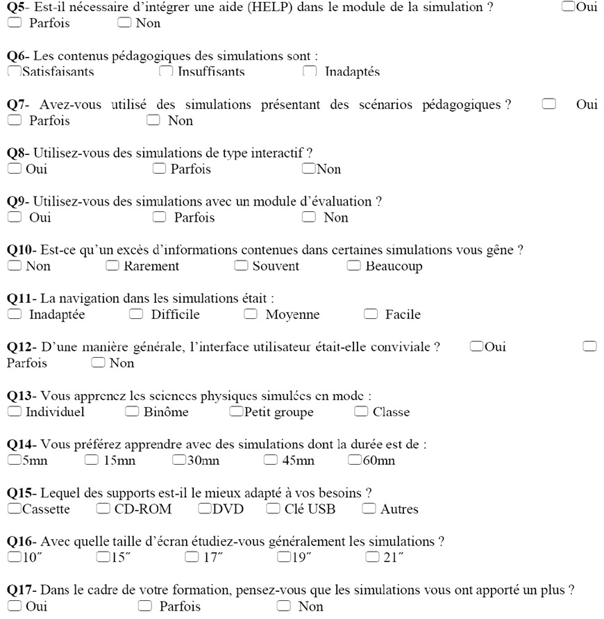 Afin d’analyser l’impact des simulations au niveau des apprentissages et interactions, surtout dans un milieu comme le laboratoire de physique, nous avons établi un questionnaire devant mesurer les pratiques des étudiants engagés dans leur processus de construction des savoirs. Cela nous a permis de le proposer comme test aux étudiants du département de Physique[2], et qui ont bien voulu répondre anonymement aux questions. Le questionnaire est structuré autour de 17 questions toutes fermées, regroupant le maximum de terminologies se rapportant au domaine de la simulation. Nous avons permis une double réponse à la question Q1, et tenu compte lors du traitement.