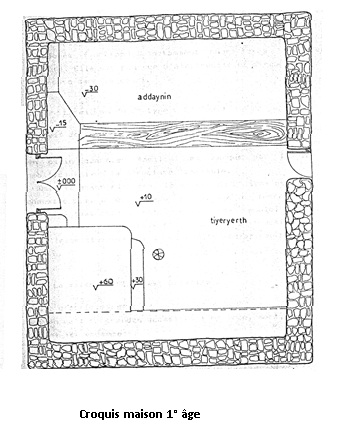 Le premier âge de la maison correspond à la maison traditionnelle qui a pu constituer un corps étanche aux injonctions externes, notamment à celles liées à l’émigration. Cette phase est chronologiquement limitée au lendemain de la Seconde Guerre mondiale et se définissait par son caractère de lutte pour la survie. La maison du premier âge se fond dans le sol où elle prend racine et en est un élément constitutif. L’utilisation de matériaux puisés dans l’environnement (pierre, bois, chaux, bouse de vache) lui confère sans conteste un caractère intégré au site. La maison creusée dans le sol s’incrustait dans les roches plus qu’elle ne s’employait à les détruire. Les impératifs liés à la topographie et au climat dictent le système d’orientation de la maison. La maison est donc perpendiculaire aux courbes de niveau permettant un bon écoulement des eaux pluviales. Les ouvertures se réduisaient à une petite fenêtre, la porte d’entrée, une petite ouverture dans le toit qui assurent un éclairage optimum ainsi qu’une ventilation thermique et une régulation ingénieuses. La maison frappe par l’austérité de l’enveloppe architecturale réduite à un seul corps, de dimensions modestes (de l’ordre de 07x08m), elle est de forme parallélipédique que couvre une toiture en pente. Un plan horizontal, une sorte d’auvent surplombant la porte d’entrée, est le seul élément architectural qui tranche avec l’austérité de la bâtisse. L’espace intérieur surprend par la superposition de plans verticaux et horizontaux conférant à la construction austère un caractère plus riche. Ces divers plans couvrent l’ensemble des activités des usages (habitants et animaux), et sont davantage mis en valeur par le mobilier. Composé d’une seule enveloppe, l’espace intérieur est structuré en trois parties horizontales : addeynin, tigergerth et takkahan, dans un ordre décroissant. Son organisation n’est pas étrangère à cette conception qui se propose de composer avec le site. Intégrant le site par la juxtaposition de niveaux qui s’adaptent à la pente, addeynin, partie réservée aux animaux, est toujours située dans la partie la plus basse, permettant ainsi une évacuation plus facile des déchets liquides et solides. Tigergerth, espace du jour, permet l’exercice des activités domestiques. Elle est structurée en plusieurs niveaux par des éléments de différenciation que sont asrir prolongé par adebdar. Takkhena est la partie haute qui surplombe addeynin et sert pour la nuit et pour ranger les réserves (plan et croquis). La maison est structurée aussi en fonction du mobilier encastré qui assure une occupation rationnelle de l’espace. Des niches creusées dans le mur ou dans la partie inférieure d’esrir servent au rangement ainsi que tadekant, une sorte de table à une hauteur de 60 cm du sol, qui assure plusieurs rôles : celui de la séparation de l’espace des animaux de celui des habitants (addeynin, tigergerth), elle permet d’accéder à takhena par des planches en bois, une sorte d’échelle, et porte les grandes jarres pour les réserves (ikoufen). Ainsi, la structuration en étage de la maison est matérialisée par des éléments construits en dur ou en bois dont esrir, tadakent.